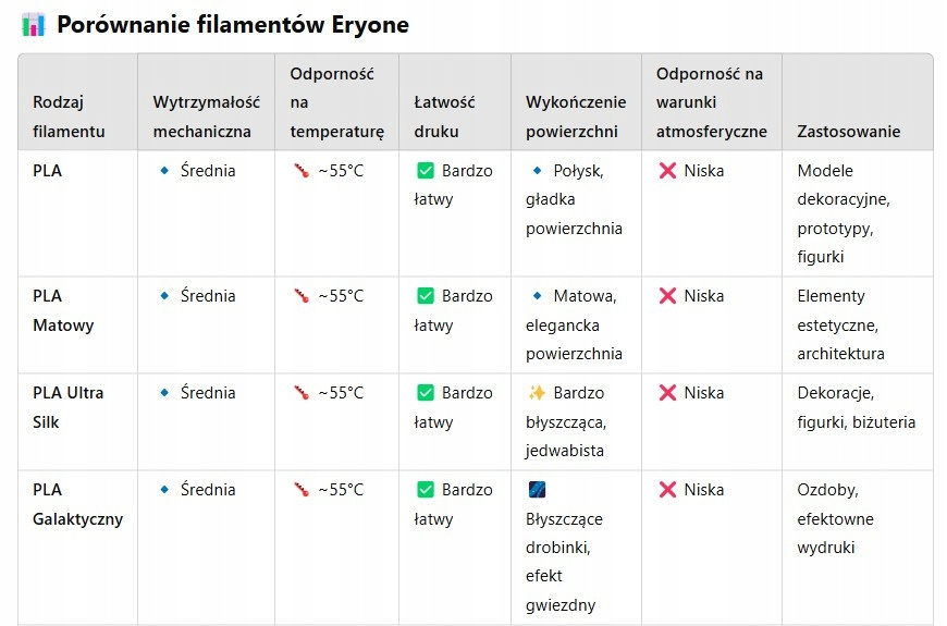 - Łatwość Druku: Niski skurcz i dobra adhezja do stołu sprawiają, że filament jest odpowiedni dla początkujących i zaawansowanych użytkowników.